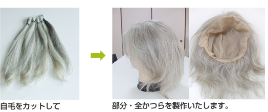 また全かつらであれば、数年伸ばした髪(20〜30センチ)をカットして 2〜3回分ほどためて頂けると作成が可能です。